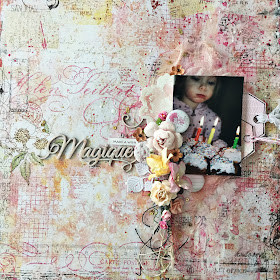 Valerie: This month's word inspired me to use this picture of my daughter with her big BIRTHDAY cake. For the creative challenge, I used some plain TAGS that I altered with modeling paste, 3 sprays and a stamp. I then glued my tags on my background and added some pretty twine matching my colour palette.