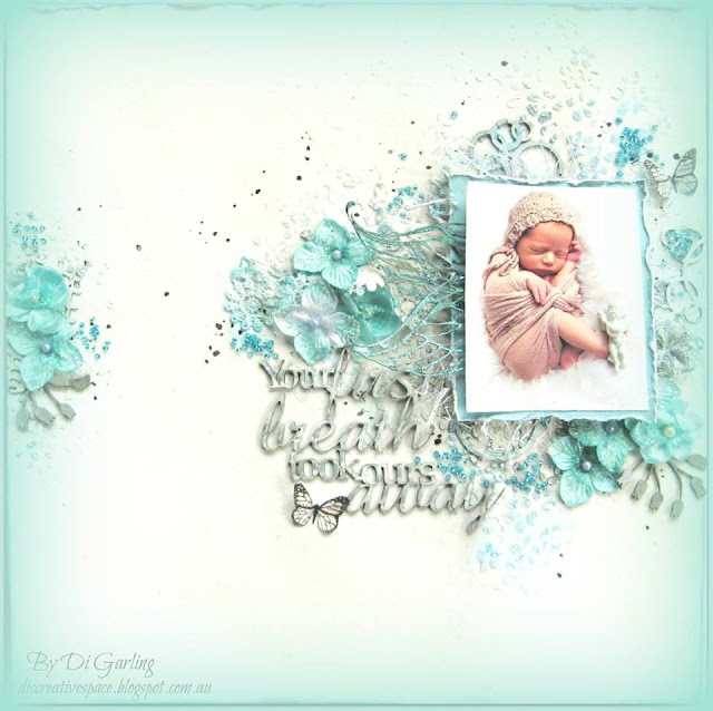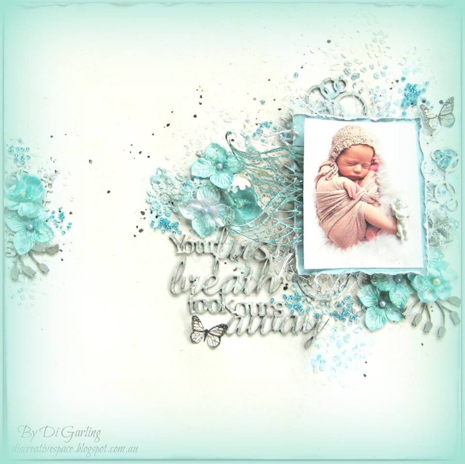 Di: "The word BLISS inspired me to scrap this gorgeous pic of my new grandson. I have also used GESSO to both seal my background as well as using it to stick down lots of laces and chipboard, etc. I also coated my title with gesso to tone down the colour as well as the little angel wings. I have also dabbed it on lots of other elements on my page to achieve a very soft look."
