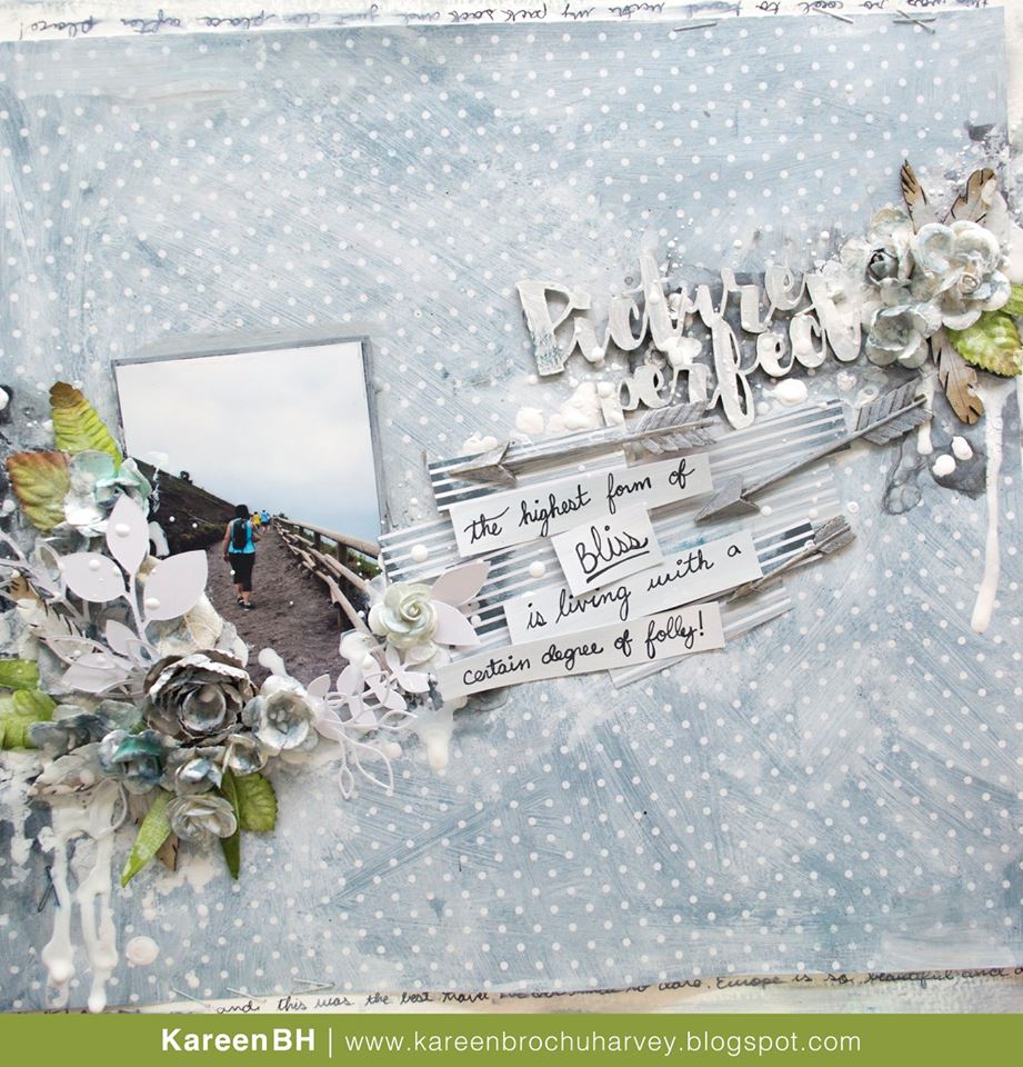 Kareen: "The word BLISS inspired me one quote which fits perfectly with the picture I've used. It's me, hiking the Vesuve, in Italy! As you can see, I've put GESSO everywhere! The papers, the flowers, the chipboard... everything has gesso on it. It was easy because I love doing mixed media layouts, but sometimes I am too lazy to start and clean after. This challenge was a great incentive!"