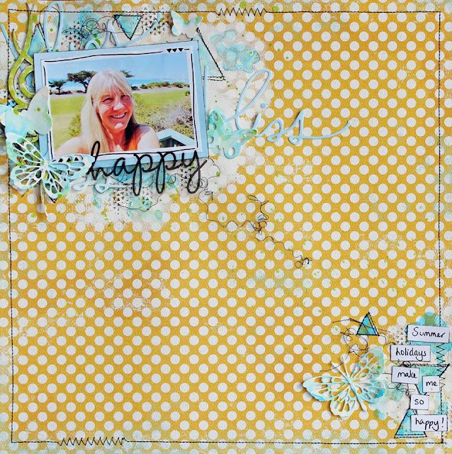 Arantzazu: "When I rediscovered this picture, I just knew I had to use it for this challenge. It is of my dear dog Koki enjoying his first day at the beach. The word BLISS is not just for that day. My 'little brother' Koki makes me one of the happiest people because I have him by my side every day. I used GESSO on the background and to create those white splashes."
