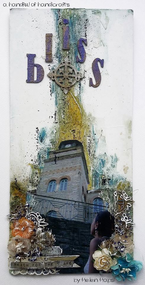 Helen: "The word BLISS inspired me to create this project because I think that there are some special places that make us feel serenity and bliss. I used a lot of white GESSO on my background and added some more
