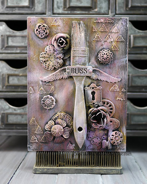 Mona: "When I'm painting, life is bliss! I was inspired to create a 'Finnabair' type canvas featuring an upcycled paintbrush reflecting my passion along with a metal plate tag reading BLISS as the title. The entire canvas was covered with black GESSO as the base coat, then white gesso was applied at the end for a highlight."