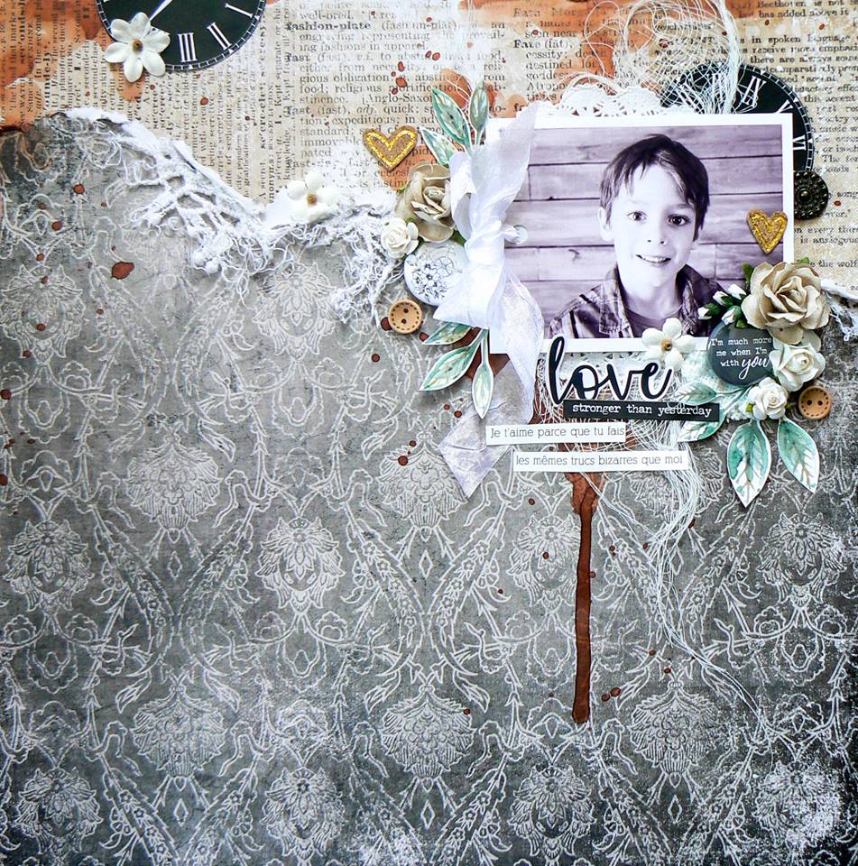Sabrina: I was inspired by both the VINTAGE creative challenge and the YESTERDAY word inspiration. I wanted to create a vintage ambience around my black and white picture by using a wood textured background along with a dull colour palette. I decided to apply a patina finish on some of the chipboards to accentuate the antique effect. I also used an aged-looking embossing powder and stamped some script writings with faded black ink.