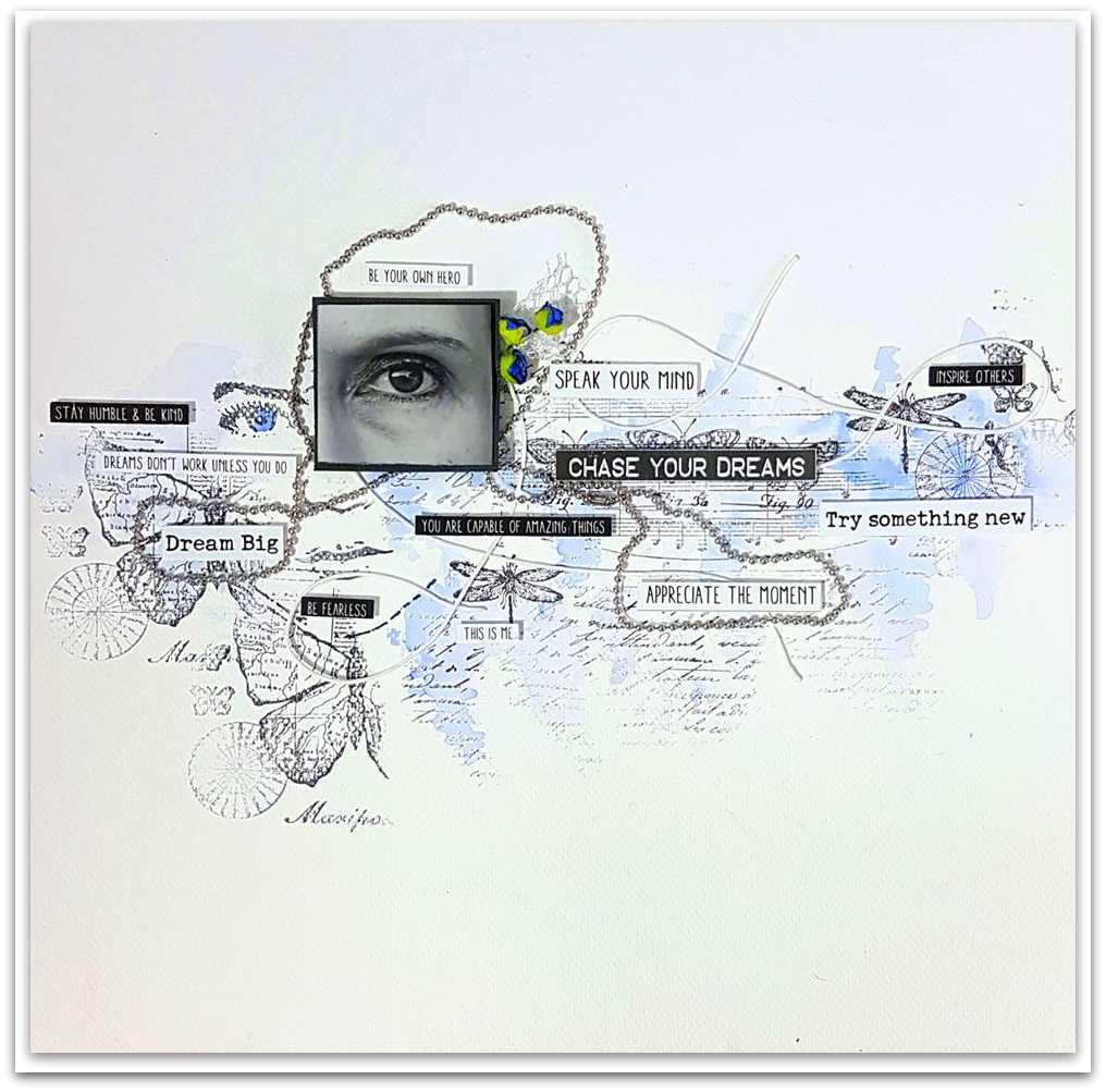 Pamela: "This challenge forced me out of my comfort zone, so I decided to go all the way and do a journal page! I found the eye symbolic of many things in life, as love and DREAMS are in the eye of the beholder. We have to visualize our dreams to make them happen. The BLACK, WHITE and blue makes for a very