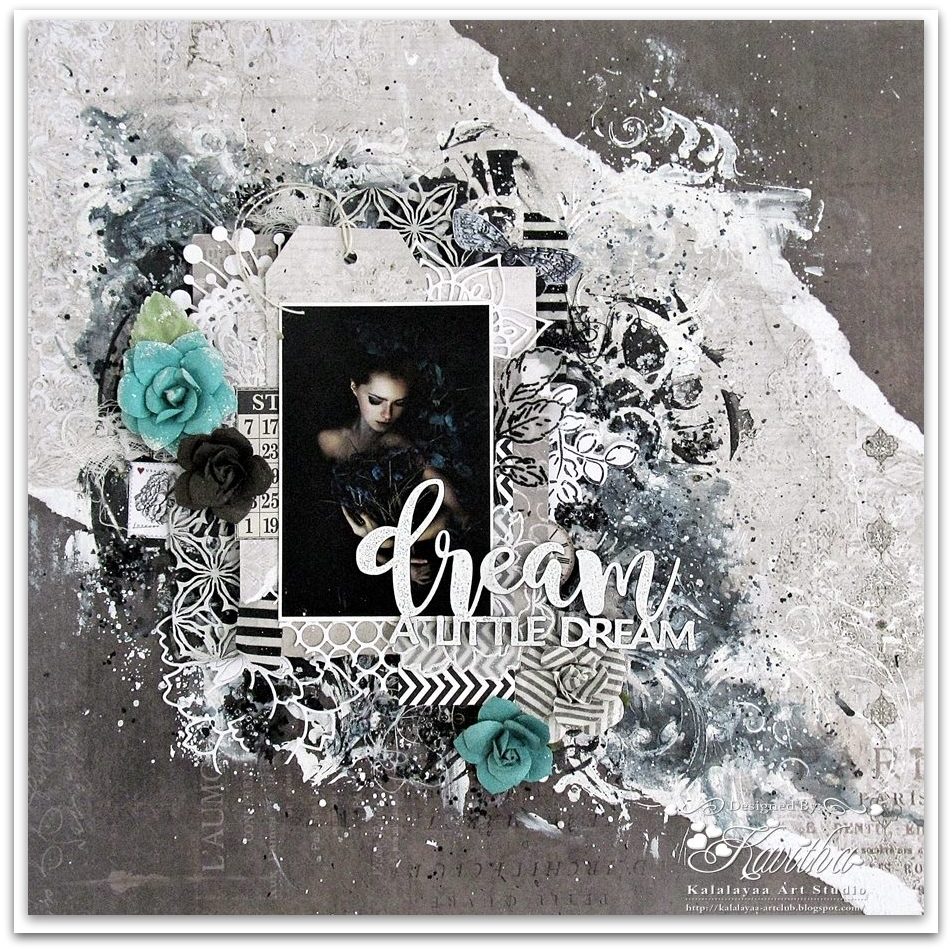 Kavitha: "The word DREAM is part of my title. Along with the word, I was very inspired by the stacked up cushions and their beautiful BLACK & WHITE patterns, so I created a layered dimensional layout with some of the same patterns (chevrons, flourishes) from the picture. I added a little teal as my 3rd colour."