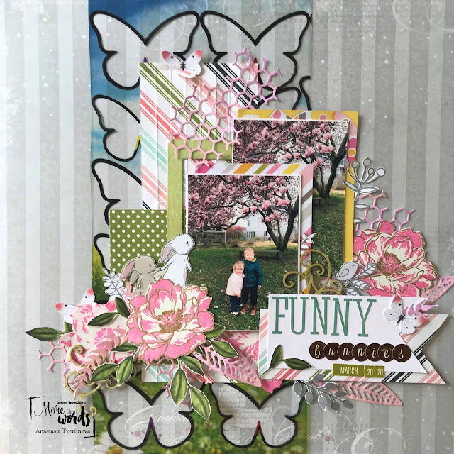 Anastasia: My FUNNY bunnies enjoy long spring walks, and I enjoy the gorgeous flowering trees such as this magnolia. I used STRIPED paper on the background from different collections, different years, and manufacturers from my stock.