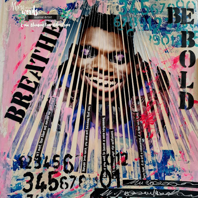 I went crazy with the COLLAGE theme here, layering all sorts of offcuts, textural items and images into a vintage book. The quote and the tissue flowers are from ArtStacks. My focal piece on the right is a stunning image created entirely by collaging strips of gelatin-printed papers. It's by the artist Amber Bennison and is also from ArtStacks.